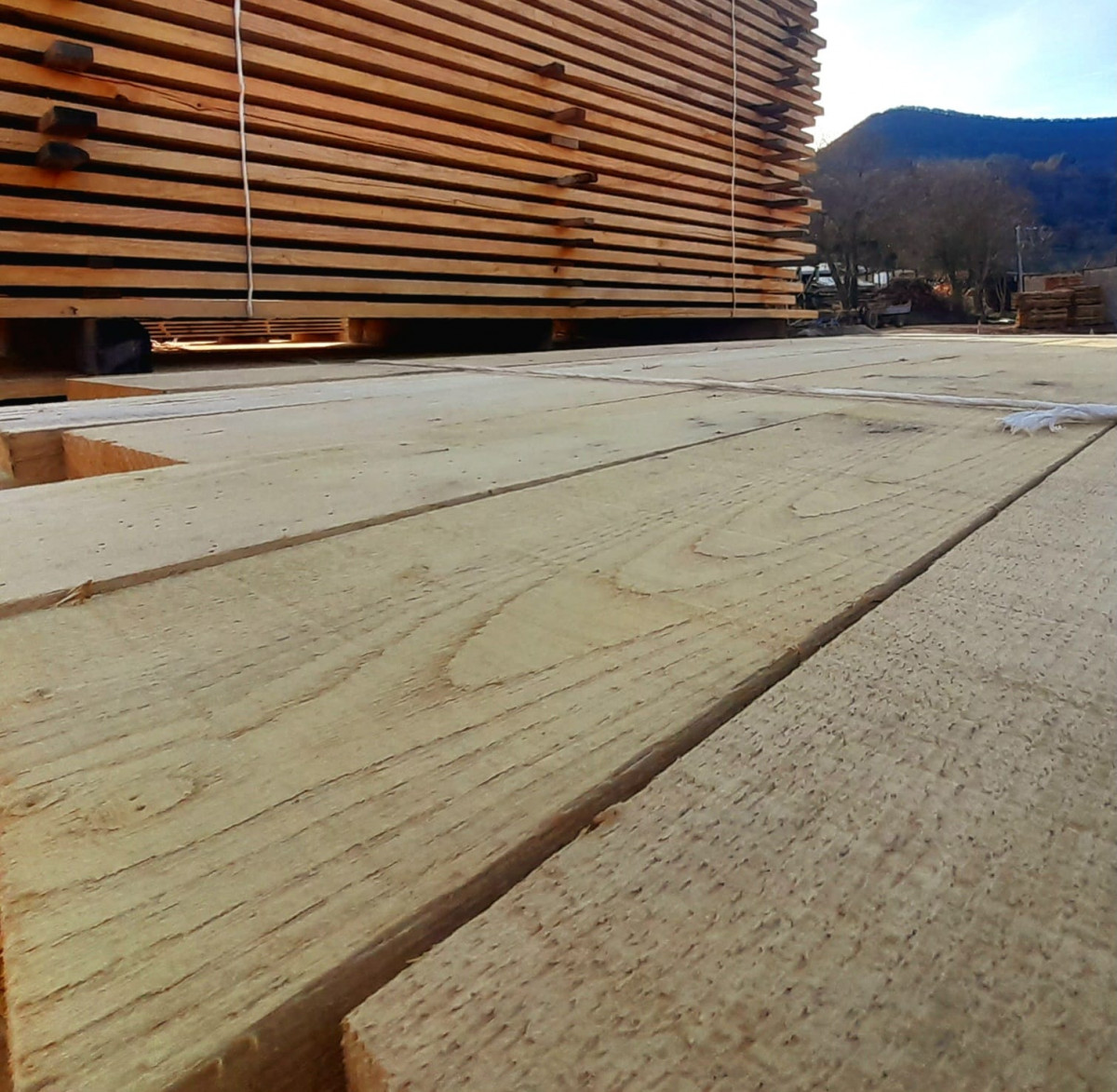 Planches en Châtaignier de toutes largeurs, épaisseur de 27 mm, brutes de sciage et sans traitement.